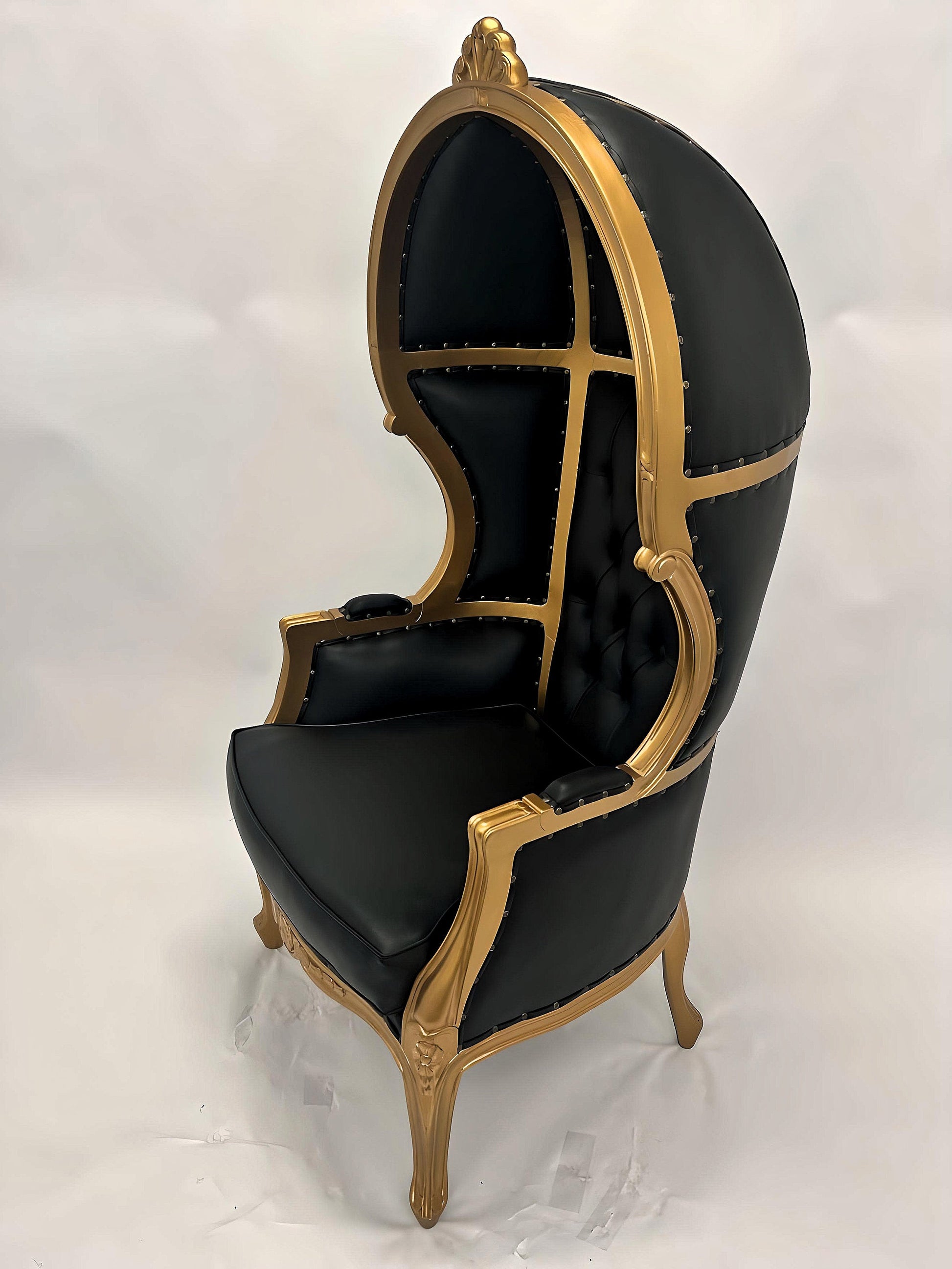 Balloon Chair | Porter Chair | Throne | Louis XV Style Tufted Dome Canopy Chair | Black Leather Gold Trim | French Inspired Design