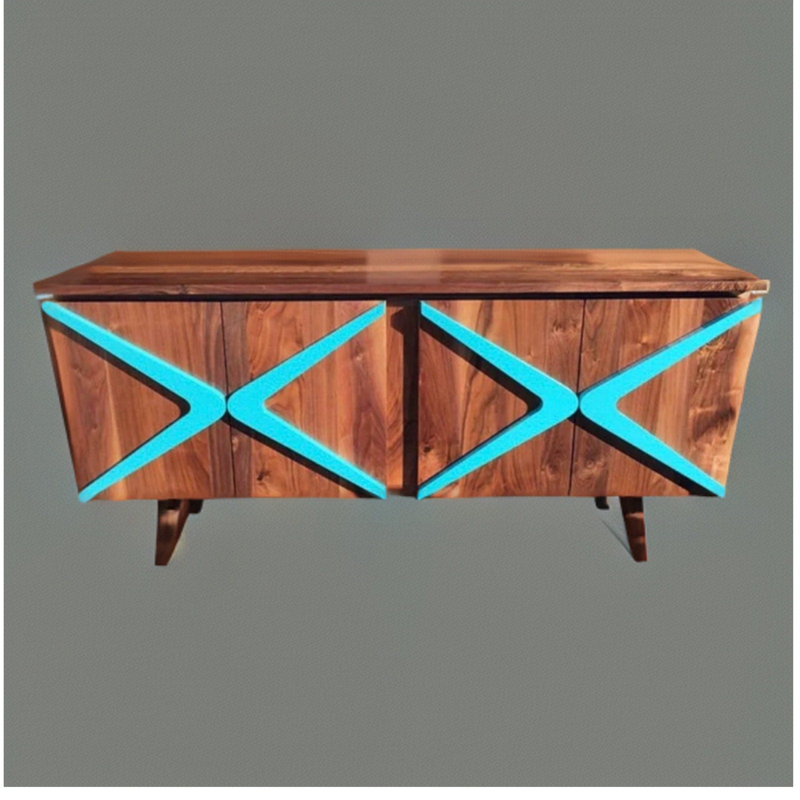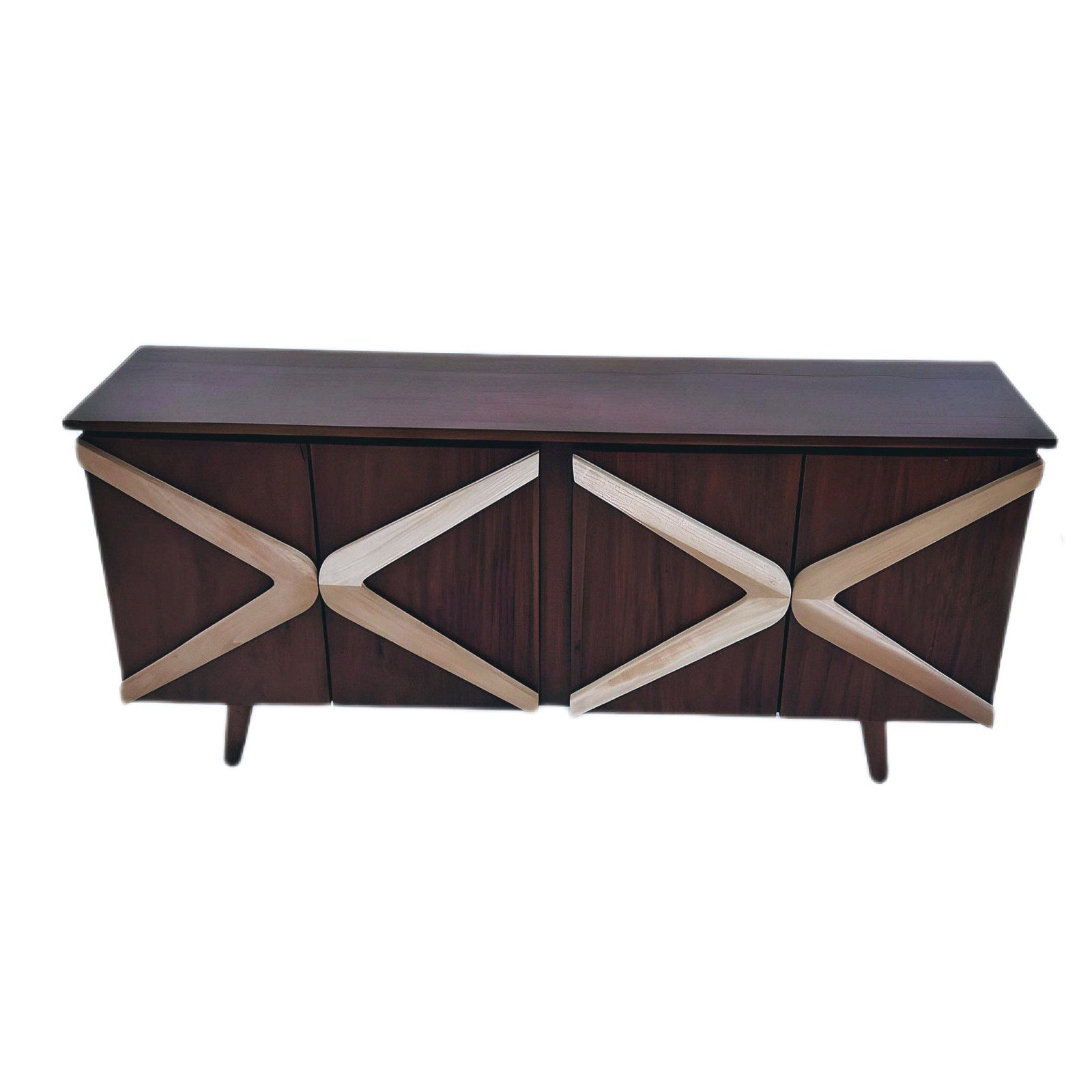 Mid-century Modern inspired Boomerang Sideboard Credenza. Hand-crafted and hand-stained in walnut. The sideboard has one shelf. Built to last generations. Boomerang comes in teal or natural wood color.