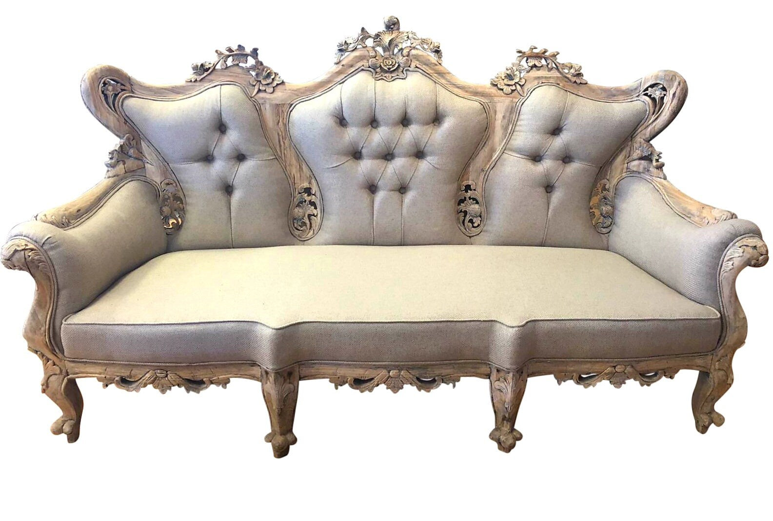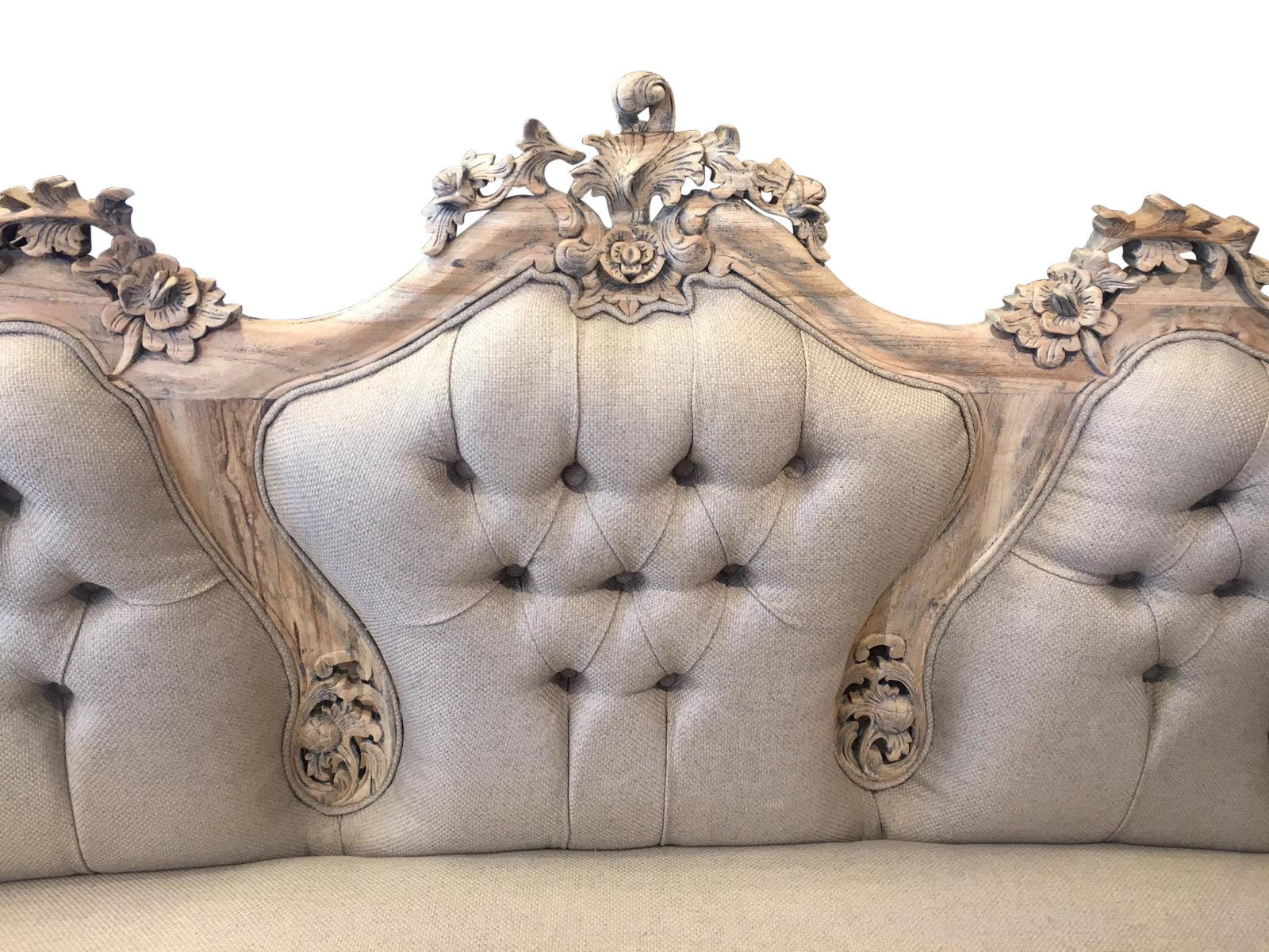 Solid Cedar wood ornate sofa. Hand-upholstered with organic fabric without any dyes.